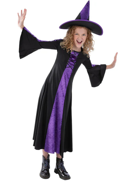 Add a splash of spooky style this Halloween with the Smiffys Bewitched Costume! This enchanting outfit features a shimmering purple and black long-sleeve witch dress with flared cuffs and lace-up detail, paired with a classic pointed witch hat.